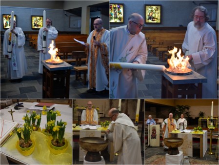 Met een 35-tal aanwezigen werd op zaterdag 8 april 2025 in de Xaverius kerk, Stille Zaterdag gevierd. Samen met onze pastoor Didier, diaken Raymond, en Marc Bresseleers werd de start gegeven om 20 u voor een stijlvolle viering. Na een korte inleiding door Didier en de aanbreng van de twee Paaskaarsen, werd het vuur ontstoken en gewijd. Raymond en Marc ontbranden de wieken van de Paaskaarsen van de beide parochies in het vuur. Vermits de aanwezigen een kleine kaars bij het binnenkomen ontvangen hadden, konden zij het Paaslicht overnemen van de Paaskaars. Daarna werd het scheppingsverhaal in een hedendaagse versie gebracht. Tijdens de gloria werd er hevig gebeld en hoorden we het geluid van enkele klokjes. Ook werden de lichten in de kerk volledig ontstoken. Na de wijding van het doopwater en hernieuwing van de doopbeloften werd de viering verdergezet, muzikaal begeleid door Magd op het orgel.