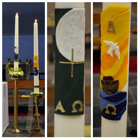 Voor Xaverius: (rechtse Paaskaars en foto rechts) ARCA NOE Noach en de zijnen kijken hoopvol uit naar de terugkeer van de duif die ze uitgestuurd hebben om te zien of ze eindelijk, na de zondvloed, de nieuwe aarde mogen betreden. En zie de tortel keert weer met een vreugdevolle boodschap: ‘Kom, alles is nieuw en betreed een nieuwe wereld.” Daarom past deze beeltenis zo mooi op een paaskaars. Zoals God met Noach een nieuw verbond aangaat zo verbreekt God door de verrijzenis van Christus de banden met de dood en geeft ons een nieuwe toekomst over de dood heen.